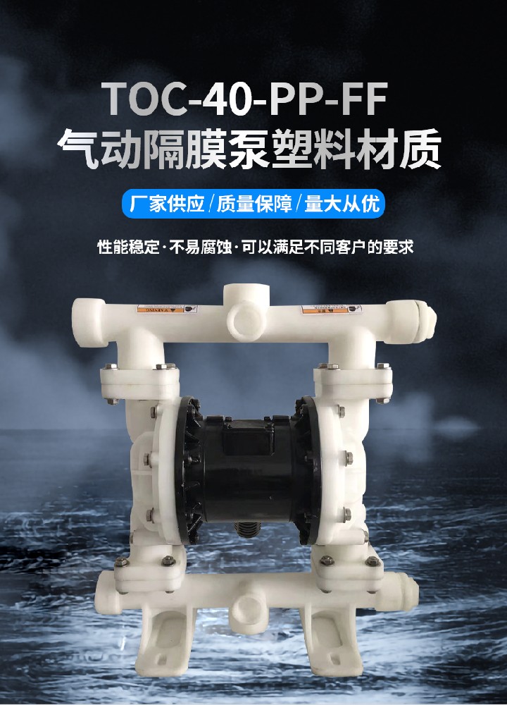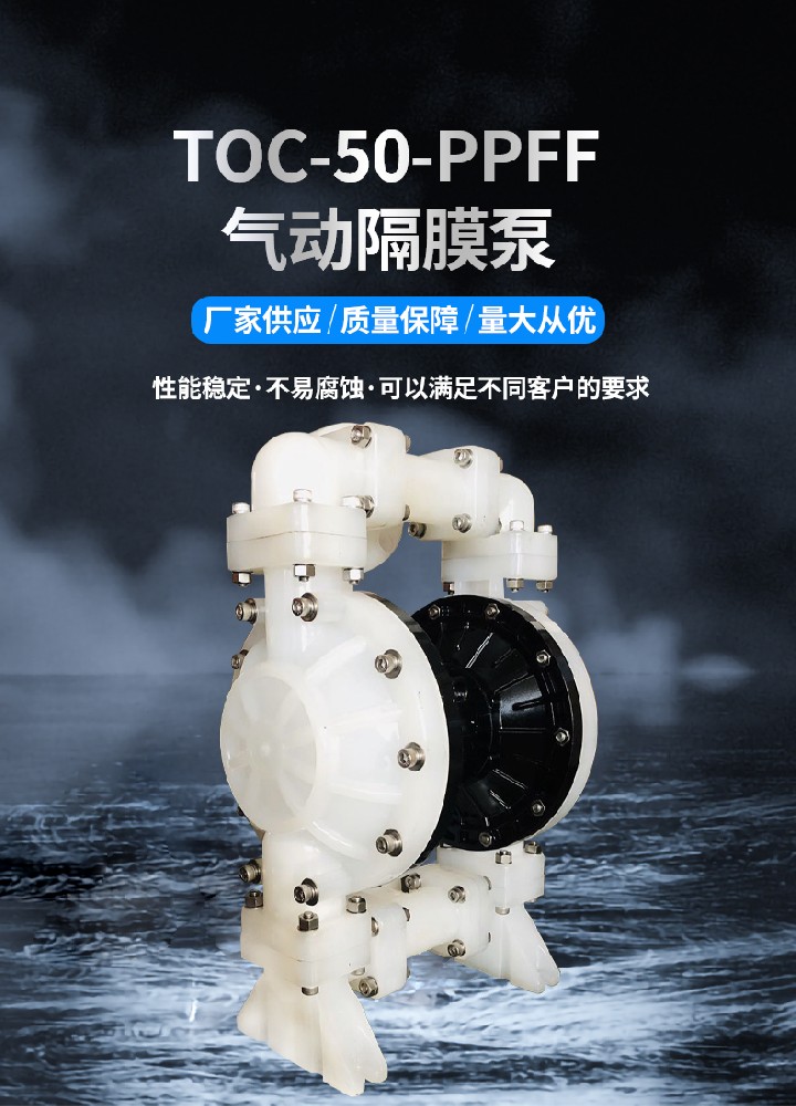 常州拓川泵業(yè)科技有限公司生產(chǎn)的氣動(dòng)隔膜泵是一種新型的輸送設(shè)備,是目前國(guó)內(nèi)最新穎的泵類(lèi)采用壓縮空氣為動(dòng)力源,對(duì)于各種腐蝕性液體,帶顆粒的液體,高粘度、易揮發(fā)、易燃、劇毒的液體,均能抽光吸盡! 本公司生產(chǎn)的TOC系列氣動(dòng)隔膜泵是一種新型的輸送設(shè)備,是目前國(guó)內(nèi)最新穎的泵類(lèi)采用壓縮空氣為動(dòng)力源,對(duì)于各種腐蝕性液體,帶顆粒的液體,高粘度、易揮發(fā)、易燃、劇毒的液體,均能抽光吸盡! 本公司生產(chǎn)的隔膜泵共有十二種規(guī)格。進(jìn)出口尺寸分別為1/4”(10mm)、1/2(15mm)、3/4”(20mm)、1” (25mm)、1.2”(32mm)、1.5” (40mm)、2( 50mm)、2.5”(65mm ) 3(